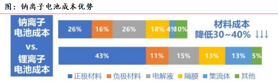 钠离子电池成本远低于锂离子电池。根据财通证券601108)等研究,相较于锂离子电池,钠离子电池材料成本约下降30%-40%。