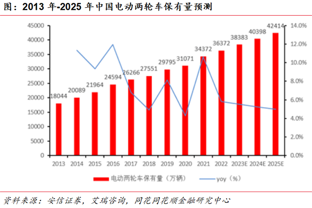 预计2023年全国电动两轮车保有量可达3.84亿辆。根据艾瑞咨询等机构统计:截至2022年全国电动两轮车保有量约3•◆•.64亿辆,同比增速5.82%。考虑到经济下行压力,假设此后同比增速逐年降低5%,据此测算得2023年-2025年全国电动两轮车保有量分别为3▪.84亿辆▲、4.04亿辆、4.24亿辆■。