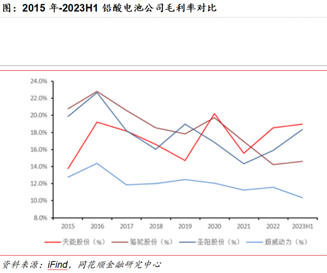 2023H1公司毛利率位于行业前列。2015年-2023H1,公司毛利率存在一定波动,但在行业中所处位置不断提升,2023H1公司毛利率约18.96%,高于骆驼股份▪、圣阳股份、超威动力…-▽。