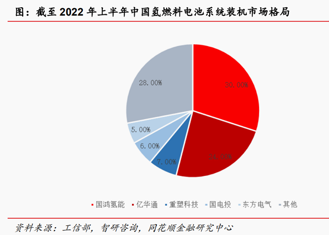 中国氢燃料电池系统装机量集中度较高,CR5超70%。根据工信部统计★=▲:截至2022年上半年▲◆◆,中国氢燃料电池系统装机量市场占比前五的企业分别为国鸿氢能、亿华通、重塑科技、国电投和东方电气600875)•◇。国鸿氢能占比30%,亿华通市场占比24%,CR5约为72%。