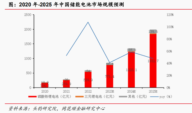 2023年中国储能电池市场份额预计达848.00亿元。根据头豹研究院的预测,2023年-2025年,中国储能电池市场规模分别可达848▷-….00亿元、1346.90亿元和1993.70亿元□;相应地同比增速分别为41.44%、58.83%和48.02%▼●;同期磷酸铁锂电池占比分别为90.97%、90•▪.96%和91-.92%。