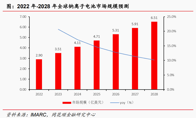 2023年全球钠离子电池市场规模预测约3.51亿美元◇▼。根据IMARC集团统计:2022年全球钠离子电池市场规模约2◁.90亿美元;2028年有望达到6.51亿美元•,CAGR约为13.20%。据此推算2023年全球钠离子电池市场规模约3.51亿美元。