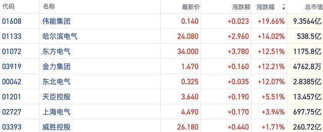 截至发稿,伟能集团涨近20%,东北电气(00042.HK)、东方电气(01072.HK)等多只个股也跟涨10%以上。